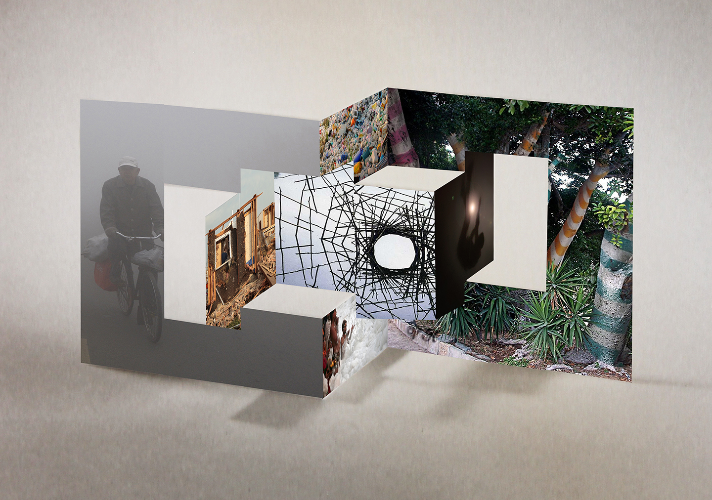 Le relief des images, de style «pop-up», augmente le dialogue possible entre ces divers niveaux de réalité car certaines images sont amenées à se chevaucher selon l’angle de vue choisi pour regarder les collages.