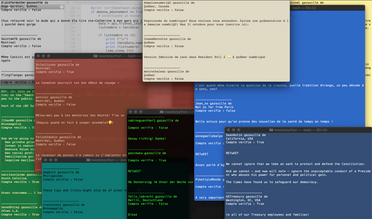 Murmures de la chambre d’écho s’inspire et s’abreuve de la circulation des messages sur la plateforme de média sociaux Tweeter. L’expression « chambre à écho » réfère à la répétition des messages qui partagés et re-partagés et re-re-partagés, mais principalement à l’intérieur d’un réseau de personnes partageant les mêmes idées, les croyances et les mêmes opinions. Les mêmes idées sont alors amplifiées comme dans une boucle de feedback, telle une cage. Grâce à un programme informatique ingénieux, l’œuvre circule d’un compte Tweeter à l’autre en suivant la trace de ses abonnés et des abonnements des abonnés. Message après message, l’algorithme génère des dialogues virtuels inventés. Le texte défile sans fin, s’étend dans l’espace sonore et se laisse saisir par le spectateur curieux.