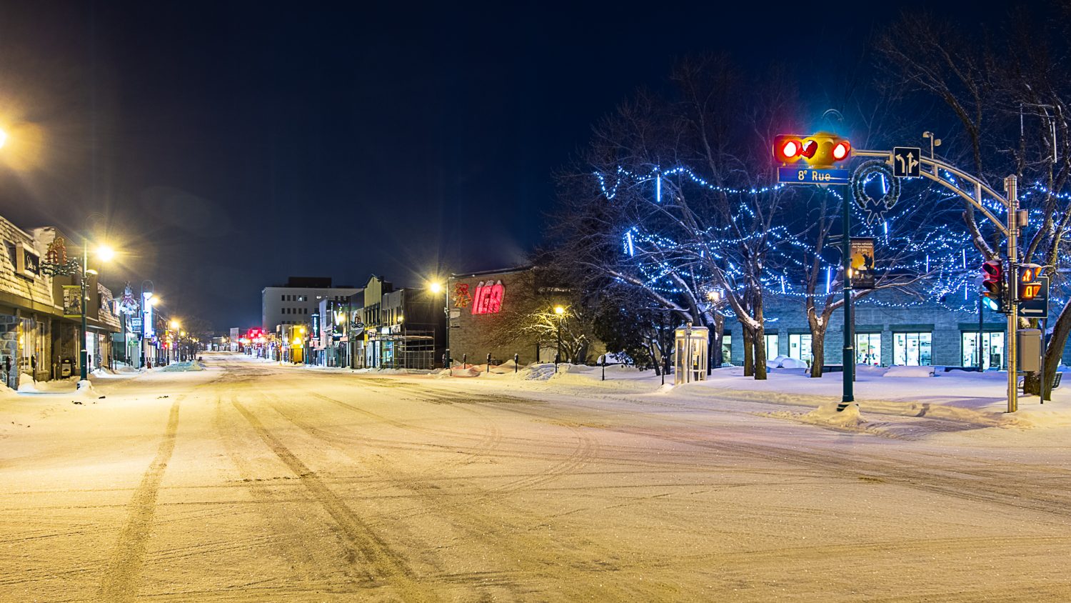 En janvier 2021, la ville de Val-d’Or était sous un couvre-feu. En effet, les mesures sanitaires d’urgence ont obligé l’ensemble de la population du Québec à se confiner. En collaboration avec VOART, le Centre d’exposition de Val-d’Or, le photographe René Lacasse a arpenté les rues. Il a documenté ces scènes de nuit où les rues normalement passantes, révèlent l’absence et le silence d’une ville devenue fantôme.