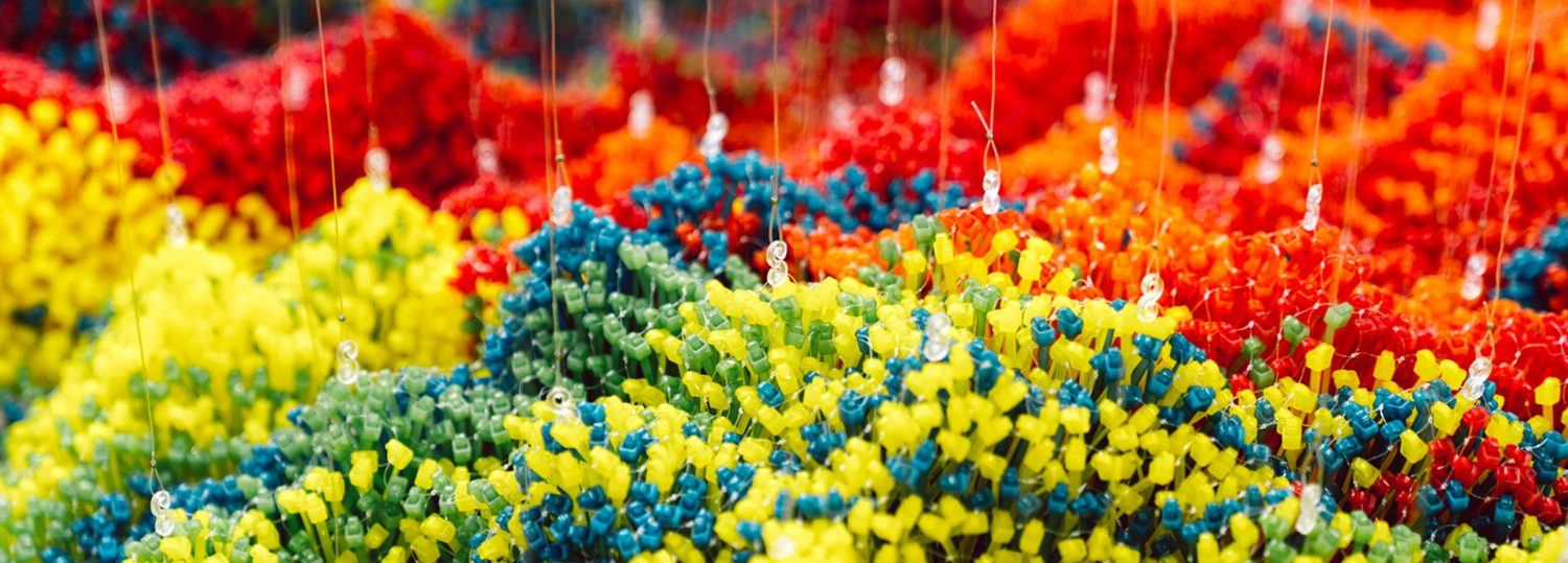 L’œuvre Rainbow Mountains est inspirée de formations géologiques constituées de motif de bandes colorées selon différents types de minéraux. Par le matériel utilisé (TY-RAP) Picard questionne les notions de culture et de systèmes s’adaptant à différentes formes sculpturales, révélant que dans le banal se cache le sublime. Sa méthodologie se développe à partir des techniques traditionnelles transmises depuis des générations telles que le nouage, la vannerie, le tapis au point noué travaillant avec des matériaux du quotidien.
